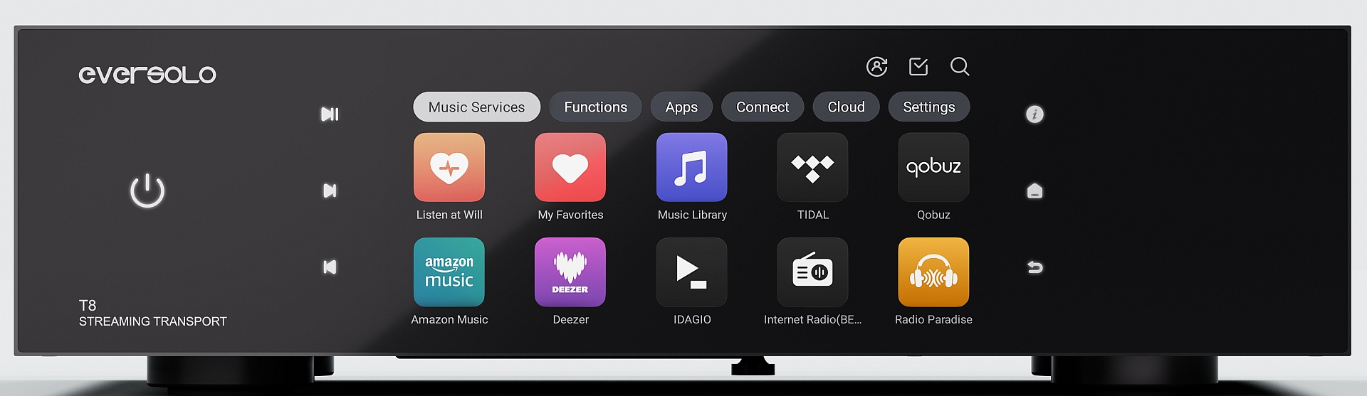 Der Eversolo T8 ist ein hochpräziser Streaming-Transport für audiophile Musikliebhaber. Er vereint kompromisslose Signalreinheit mit fortschrittlicher digitaler Signalverarbeitung. Als Digitalzuspieler ohne integrierte D/A-Wandlung bietet er die perfekte Grundlage für hochwertige externe DACs. Streamingdienste wie TIDAL, Qobuz oder Apple Music werden unterstützt - ebenso hochauflösende Formate bis DSD512 und PCM 768 kHz/32 Bit. Die Bedienung erfolgt über das 6-Zoll-Touchscreen-Display, die mitgelieferte Fernbedienung oder die Eversolo Control App für Smartphones und Tablets.